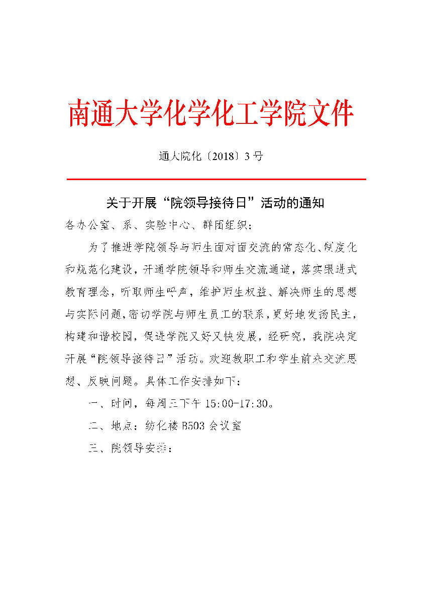 通大院化〔2018〕3号关于开展“院领导接待日”活动的通知
