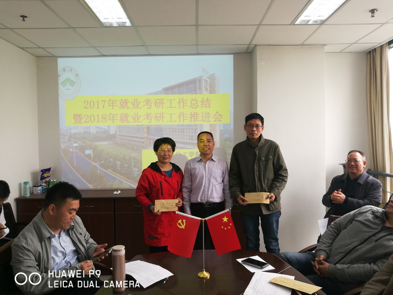 会议有3个议程:首先由公司党委副书记、副经理张爵宁老师宣读2017年就业考研工作先进集体和个人表彰决定,并颁发奖励证书。其次,去年就业考研工作先进个人化工系的喻红梅老师、高分子材料系的倪朝辉老师做经验交流,两位老师分别就就业考研中的优秀做法和大家进行了毫无保留的分享。随后,由负责学院2018届毕业生工作的杨凯老师布置今年的就业工作,结合分析学院考研和就业现状和今年目标考核的指标,和各位系主任班主任沟通交流。