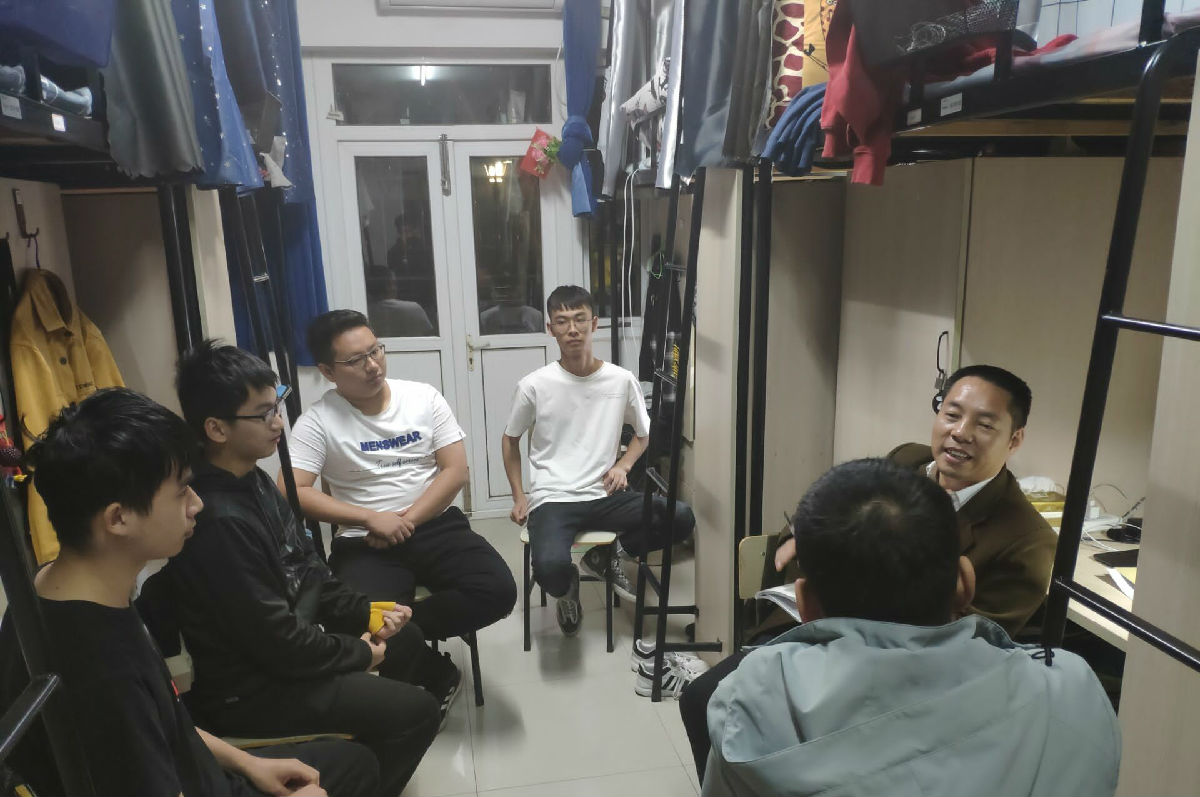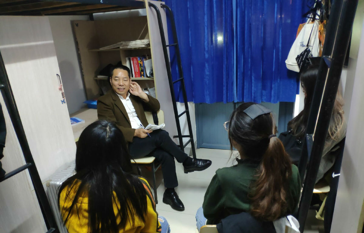 10月17日晚,张爵宁走进员工宿舍,与员工在宿舍促膝谈心。他充分了解班级学习风气、专业素养和未来发展。在宿舍走访过程中,同学就学院专业教育、学风建设和班主任辅导员的工作情况谈了自己的看法,并提出一些工作建议。