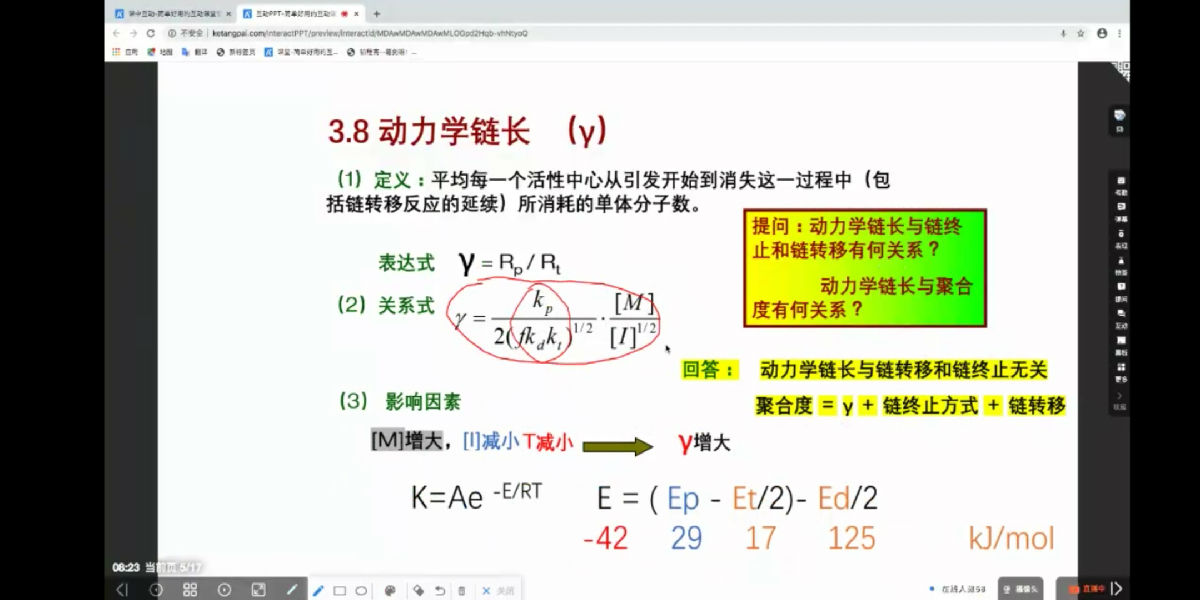陆亚清老师主讲的《高分子化学》通过回顾自由基聚合速率的影响因素,引入新课自由基聚合聚合度的影响因素。通过近来颇受关注的口罩防疫物资用聚丙烯熔喷料的介绍,揭示了聚合度控制的重要性,同时融合课堂思政,对比市场乱想介绍国企担当。通过回到聚合度的基本概念,层层递进,抽丝剥茧,讨论了聚合度的影响因素。课堂讲解生动活泼,富有激情,通过形象的举例,能抓住课堂注意力。与员工时有互动,总能得到积极回应,取得良好的教学效果。