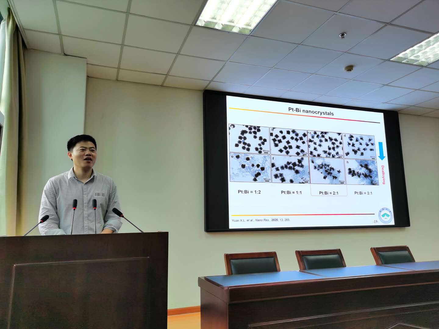 此次学术沙龙的主题是“魅力纳米材料”,年轻教师袁小磊博士和李奇博士分别作了题为《贵金属纳米材料的液相可控制备及其催化应用研究》以及《功能碳纳米材料制备、 ORR、超级电容器、锌空电池和锂硫电池》的报告。两位报告人从无机纳米材料的制备、表征、到应用,例如电化学催化,超级电容器,储能等方面做了详尽的汇报。参加学术沙龙的教师和研究生讨论热烈,精神饱满,效果显著。