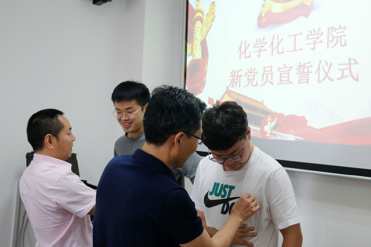 公司党委书记朱广华老师、公司党委副书记张爵宁老师等还为新党员佩戴党徽。