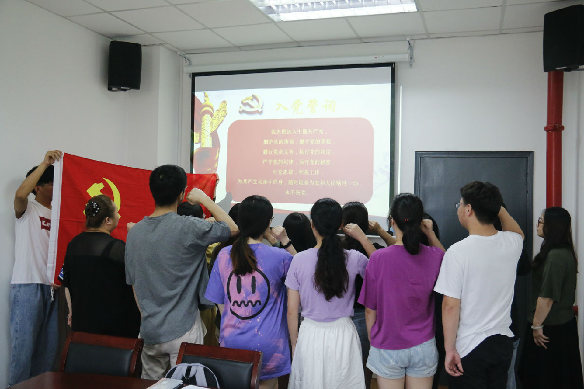 在员工第二支部书记顾欢老师的领誓下,学院22位新发展入党的预备党员,面向党旗,庄严宣誓。