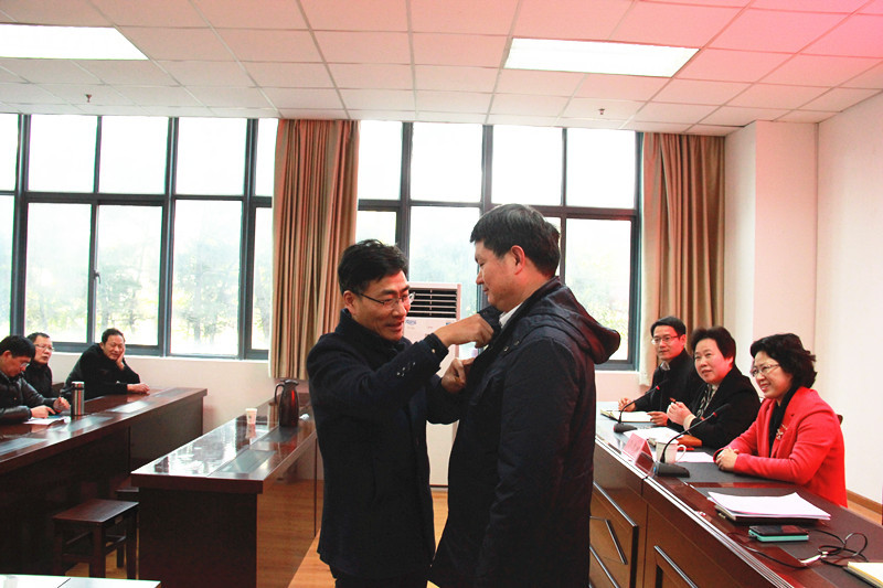 活动中举行了佩戴校徽仪式,朱广华书记为刘敬印佩戴校徽。