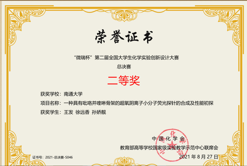 8月25-27日,“微瑞杯”第二届全国老员工化学实验创新设计竞赛全国总决赛在青岛科技大学举行。经过激烈角逐,云顶国际官方网站的参赛作品《一种具有吡咯并喹啉骨架的超氧阴离子小分子荧光探针的合成及性能初探》荣获全国二等奖(参赛员工团队:王发、徐远香、孙娇靓,指导老师:杨冰、张玉明)。