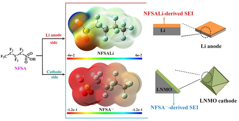 LiNi0.5Mn1.5O4(LNMO)阴极由于其高工作电压(相对于Li/Li+约4.7 V)而可以提供高能量密度,并且Li金属阳极也具有非常高的理论比容量(3860 mA h g-1)和最低的负电化学电势(相对于标准氢电极为−3.040 V)。高电压(5V级)锂金属电池(LMB)在便携式电子市场上前景广阔,对电动汽车(EV)或混合动力电动汽车(HEV)的应用极具吸引力。本工作巧妙地引入九氟丁烷-1-磺酸(NFSA)作为添加剂,促进形成更稳定、更坚固的SEI膜,从而有效地保护阳极和阴极。因此,LNMO//Li-LMB电池在循环400次后仍具有93%的容量保持率与稳定的库仑效率,解决了高压(5V级)LMB的衰减问题。